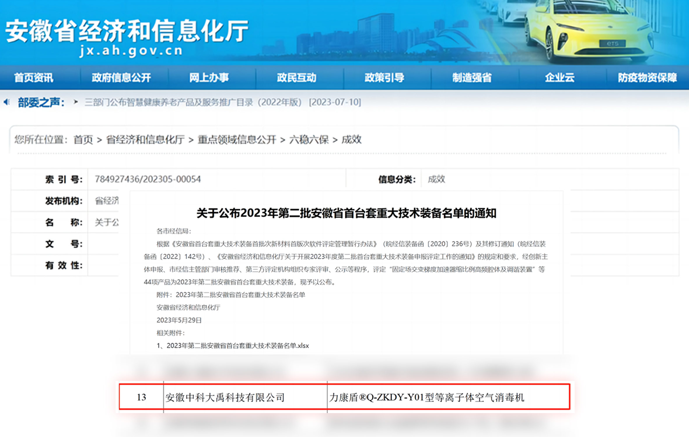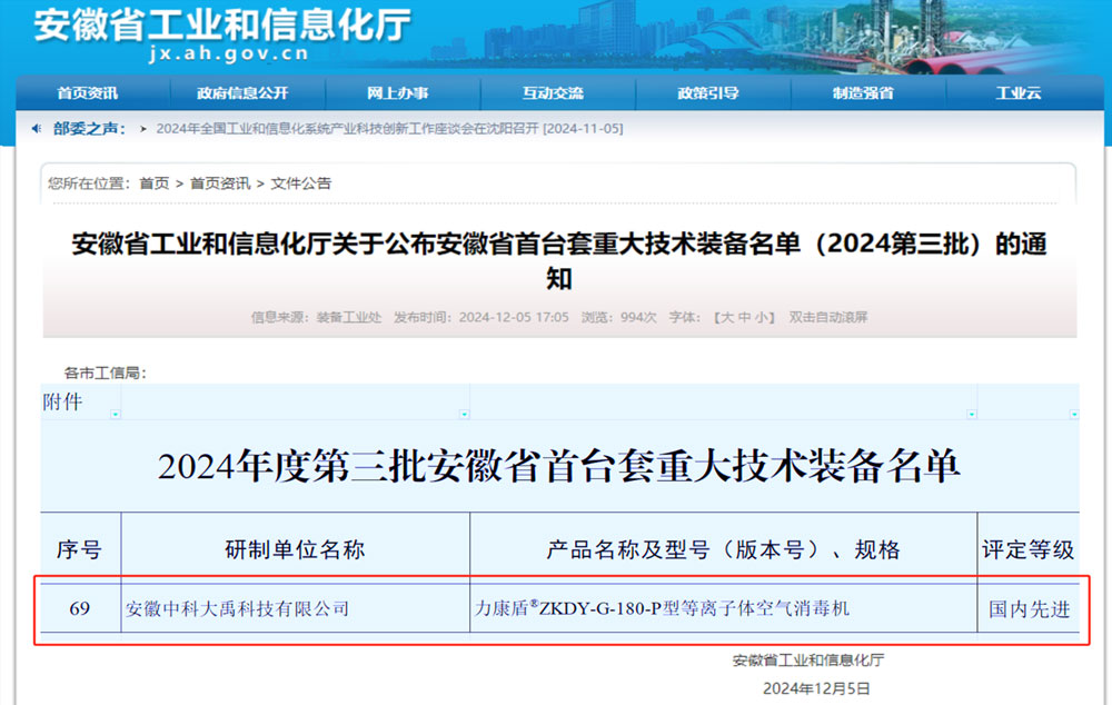 力康盾?ZKDY-G-180-P型等離子體空氣消毒機(jī)入選2024年度第三批安徽省首臺(tái)套重大技術(shù)裝備,評定等級(jí):國內(nèi)先進(jìn)